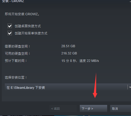 启动加速后,点击启动游戏,这个时候会自动启动STEAM,然后会弹出游戏下载窗口,点击下一步,开始下载即可。