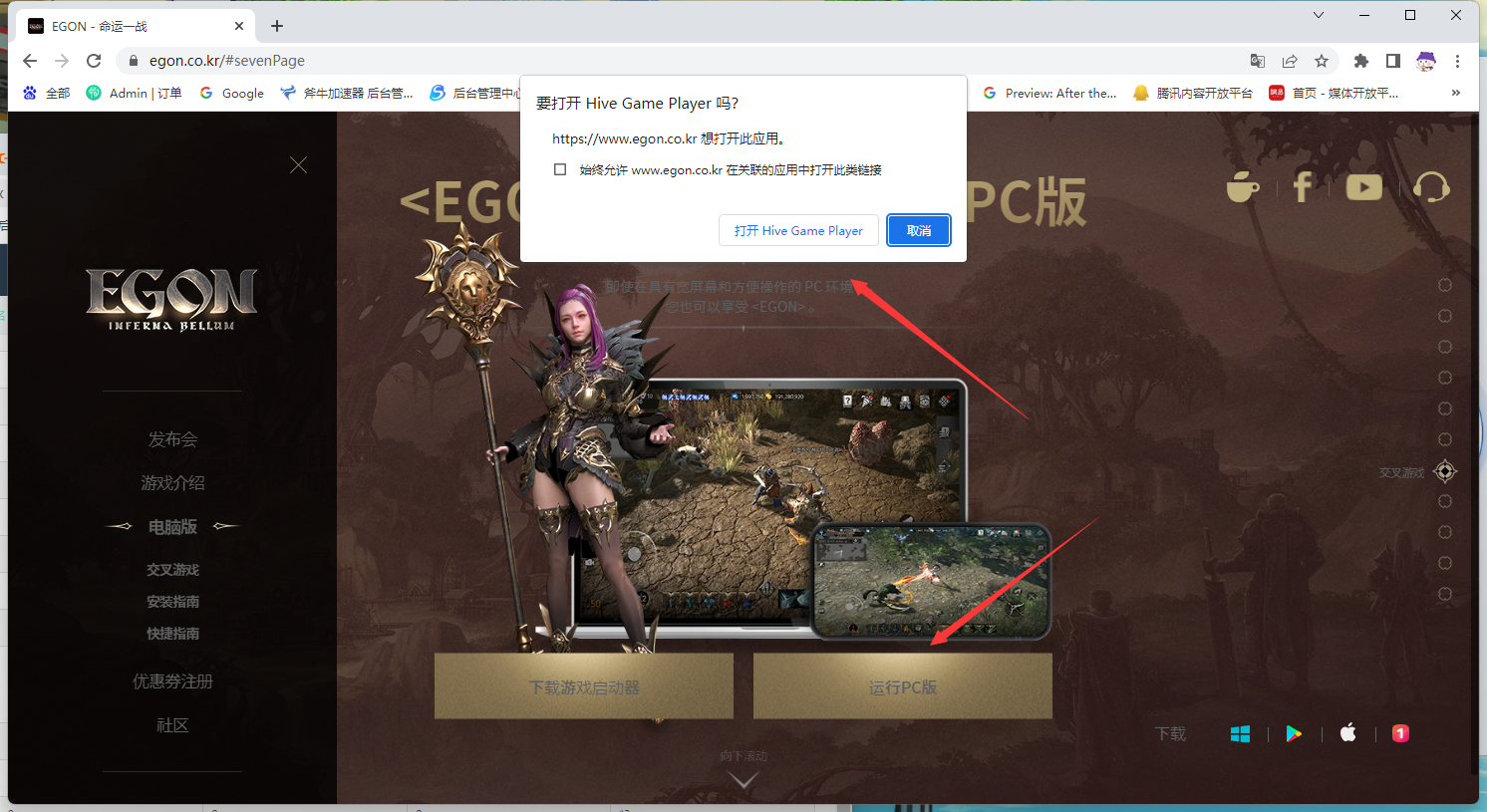 第三步:登陆器安装完成后,回到官网,点击右侧运行PC客户端,然后会弹出网页需要启动游戏客户端的提示,点击打开。